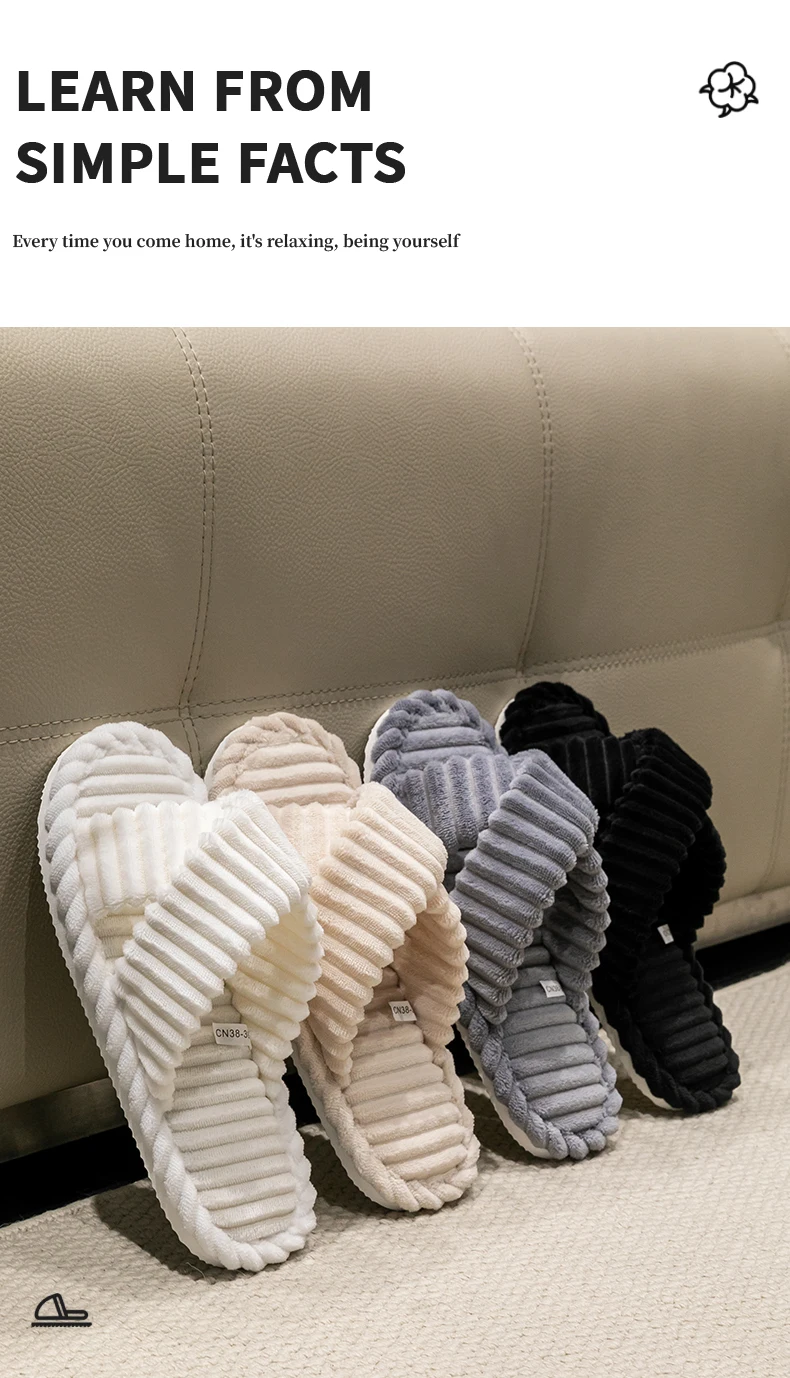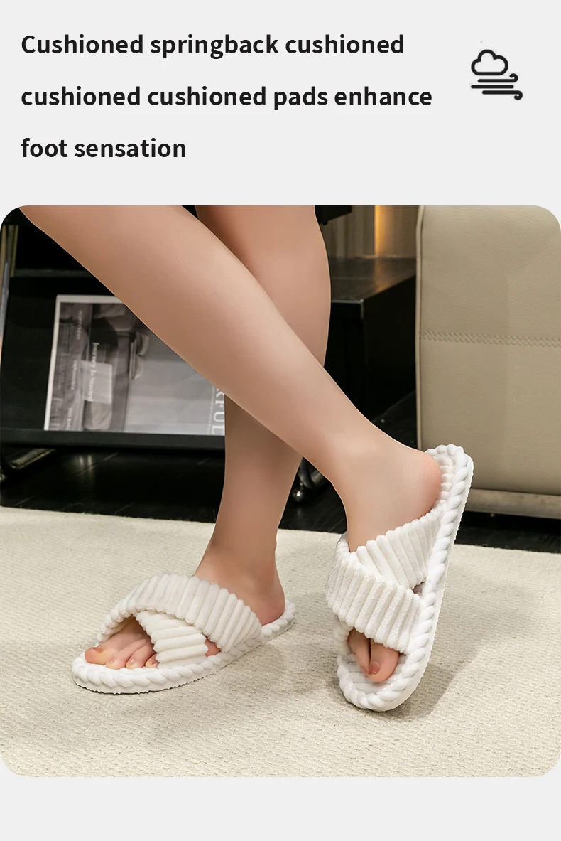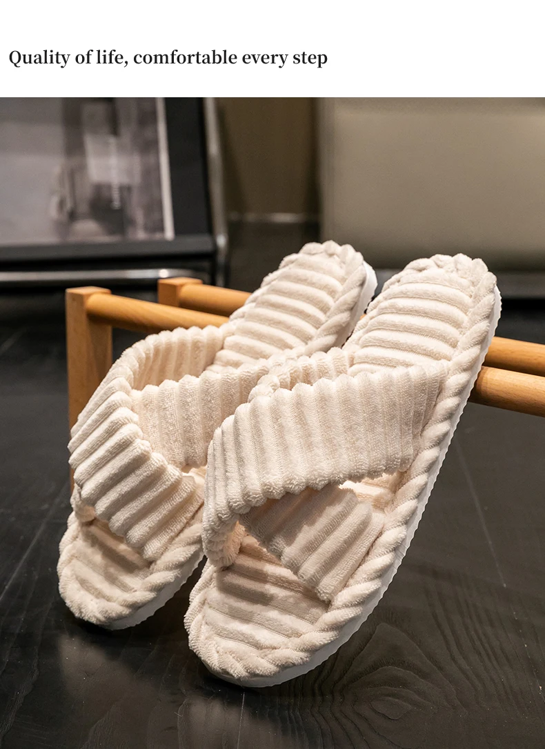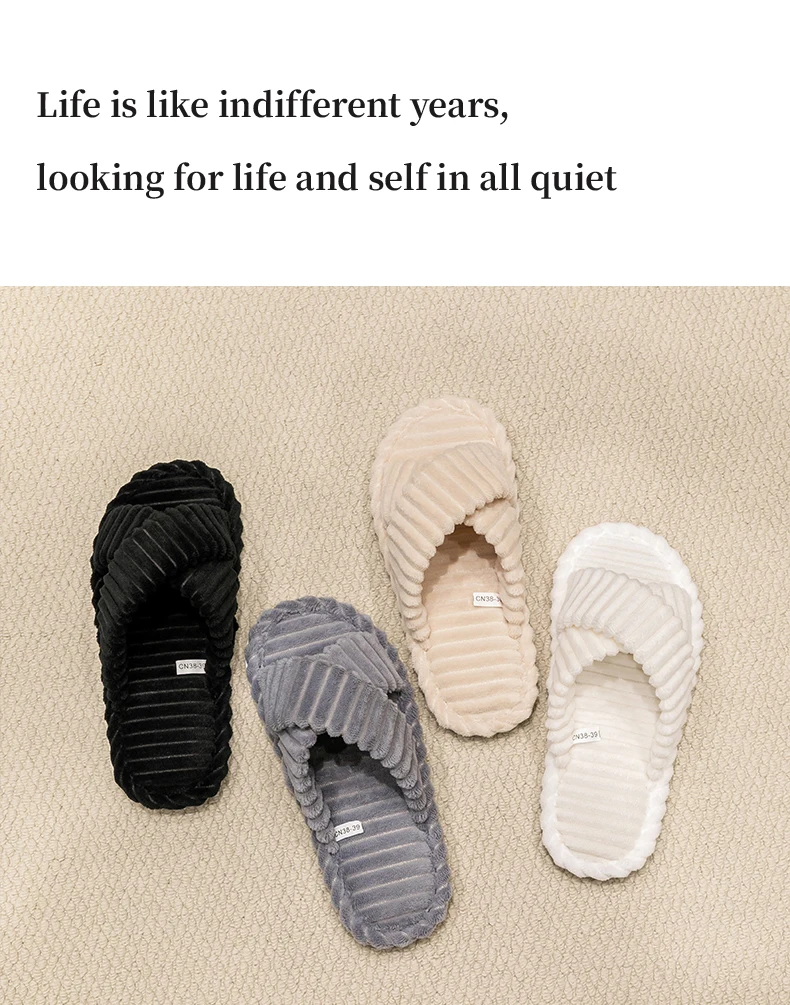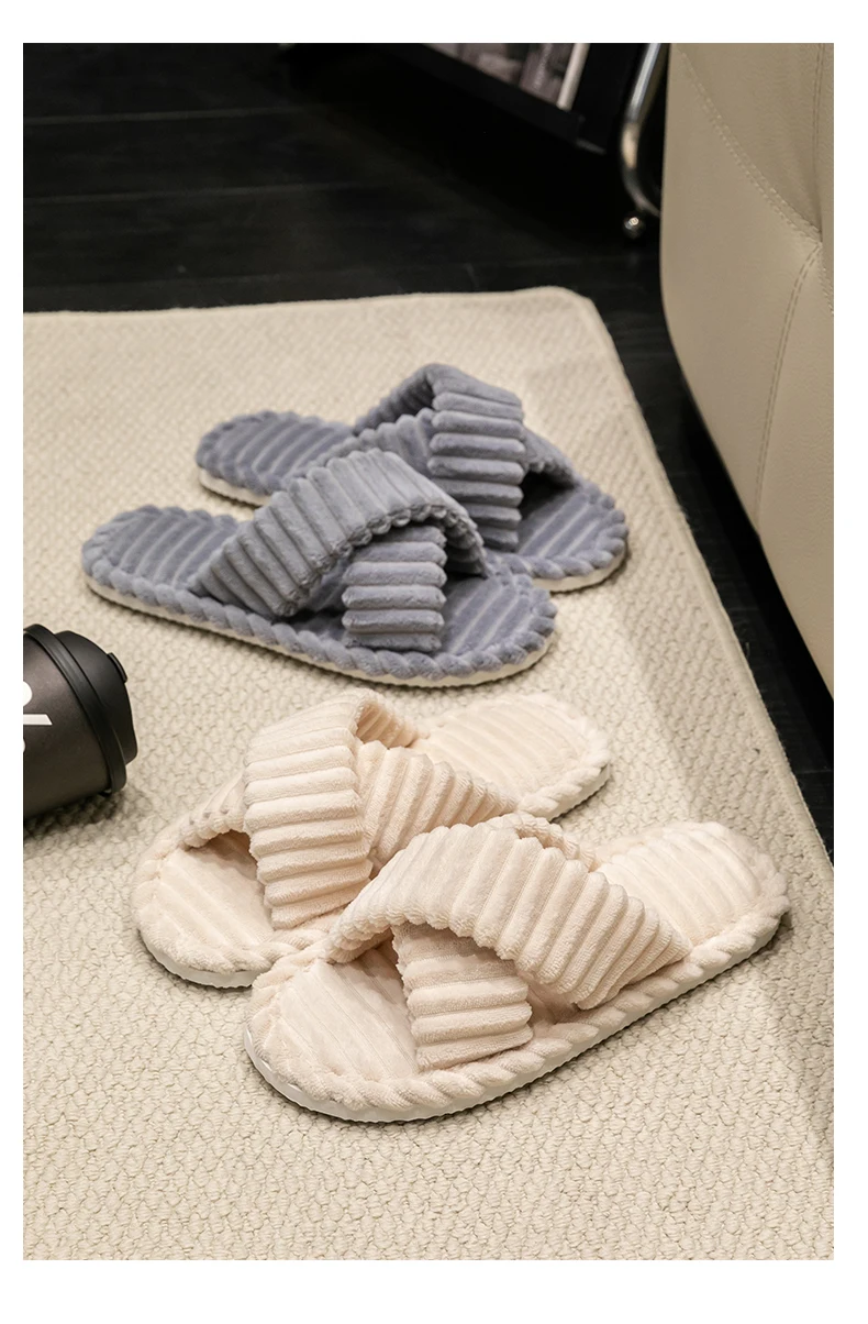 Fashion Corduroy Cross band Open Toe Home Slippers Women Autumn Winter Warm Plush Slides ladies Bedroom Soft Sole Slippers