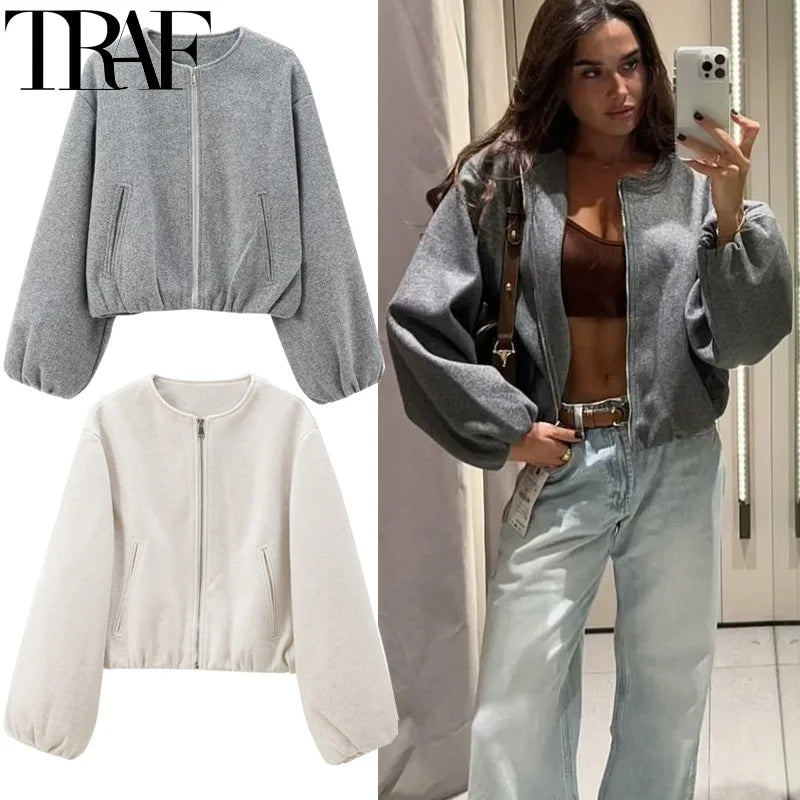 TRAF Outerwears Cropped Bomber Jacket Women Autumn Long Sleeve Faux Wool Coats For Woman Winter Zip Up Gray Beige Short Coats
